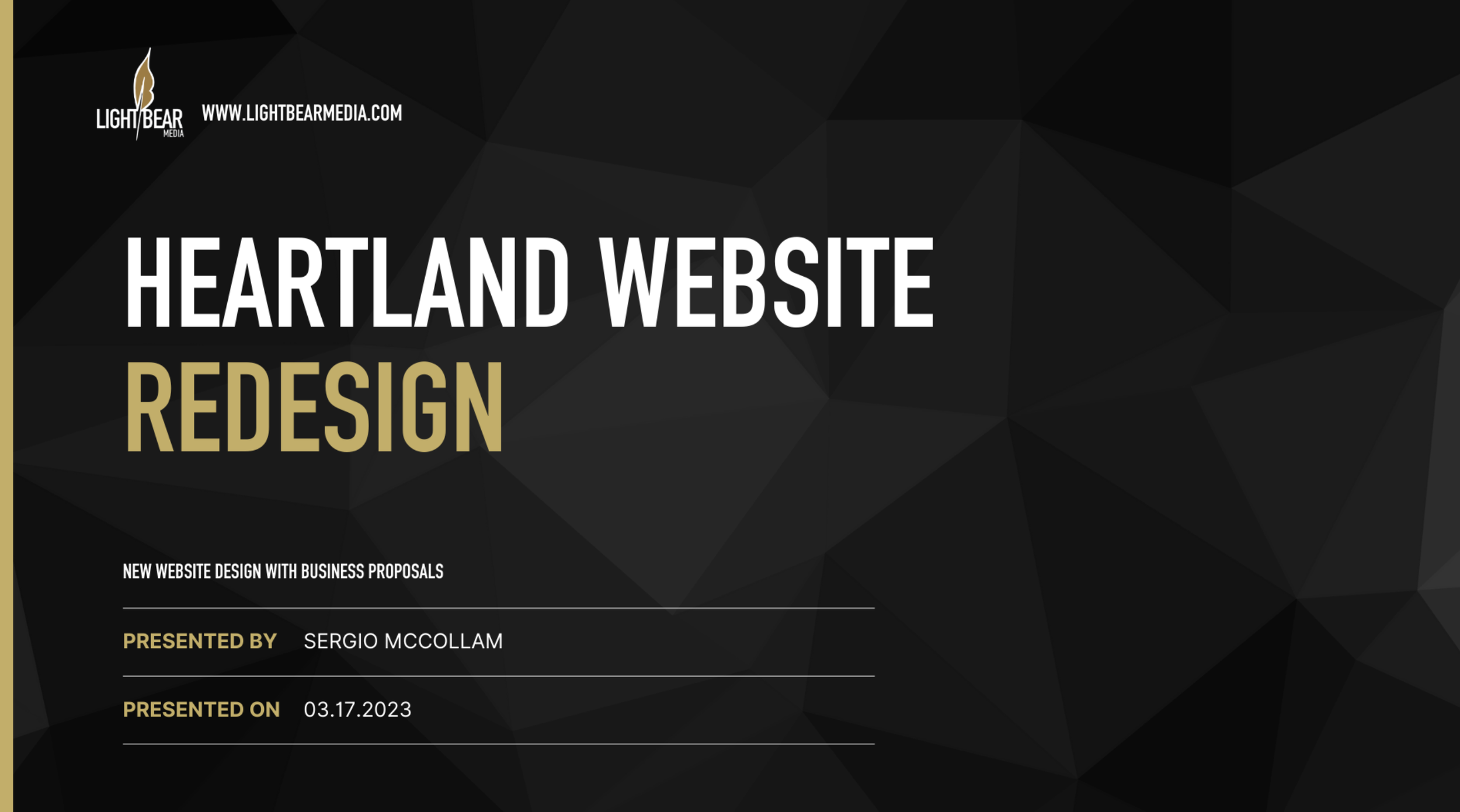 Website ReDesignPhase 1 BeforeOption 2Option 1 GOALS AND PLAN CREATE A NEW WEBSITE USING SQUARESPACE PLAN A LET’S WORK TOGETHER PLAN B LIGHTBEARMEDIA BUILDS THE WEBSITE AND HANDS OFF TO HEARTLAND STAFF PLAN C HIRE LIGHTBEARMEDIA AS NEEDED communicate progress, provide updates and work towards a goal